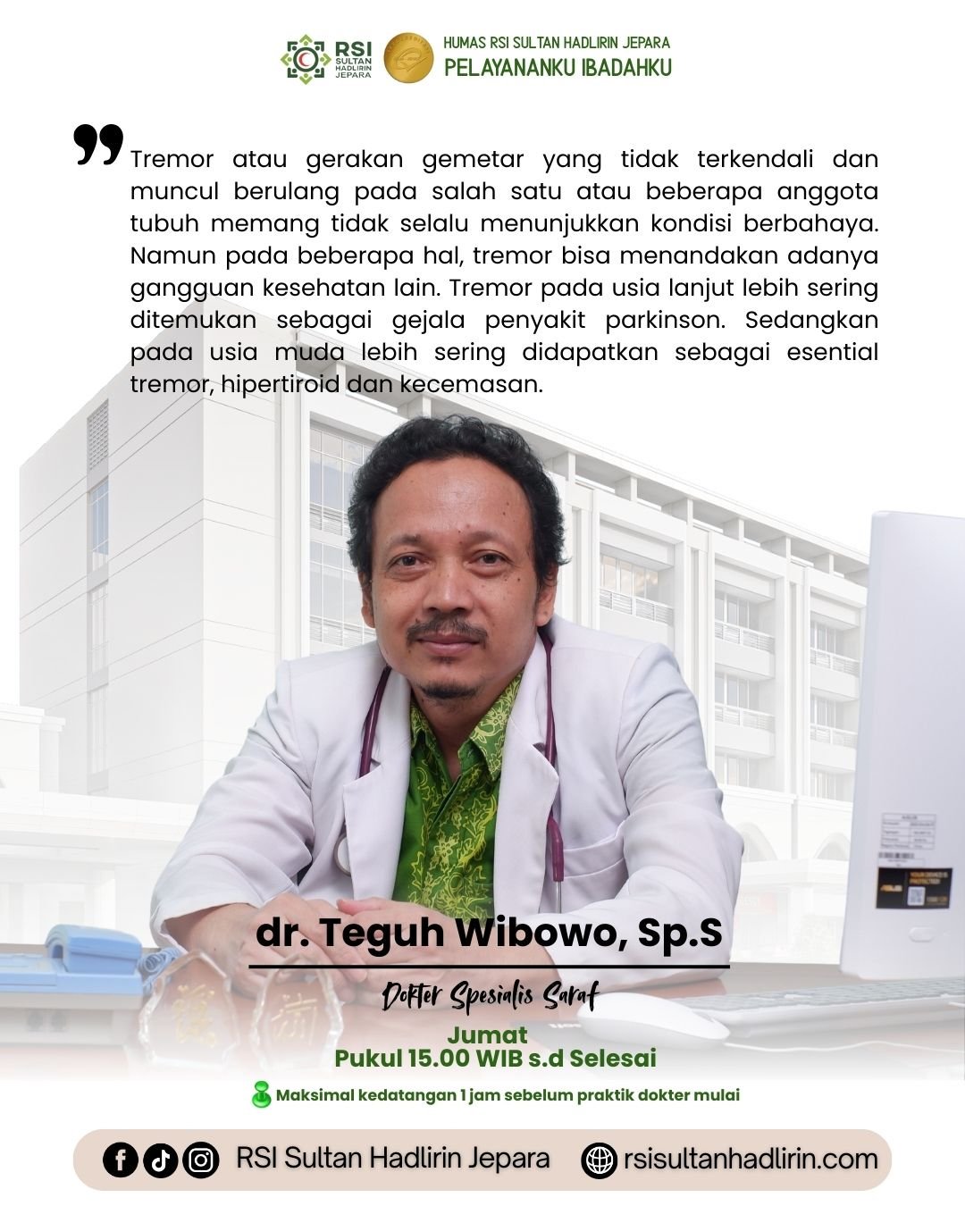 Rasa syukur Alhamdulillah kami panjatkan ke hadlirat Allah SWT yang telah memberikan taufiq dan hidayah-Nya, sehingga penyempurnaan website dan profil kesehatan RSI “Sultan Hadlirin” Jepara dapat berjalan lancar. Penyempurnaan ini diharapkan dapat membantu memenuhi kebutuhan masyarakat untuk mendapatkan informasi dan meningkatkan derajat kesehatan secara umum, khususnya di RSI “Sultan Hadlirin” Jepara yang kemudian dapat digunakan oleh pemakai data baik pemerintah maupun swasta. Selain itu, website ini dilengkapi dengan fitur pendaftaran online sehingga dapat mempermudah pasien dan keluarga dalam melakukan pendaftaran online.
