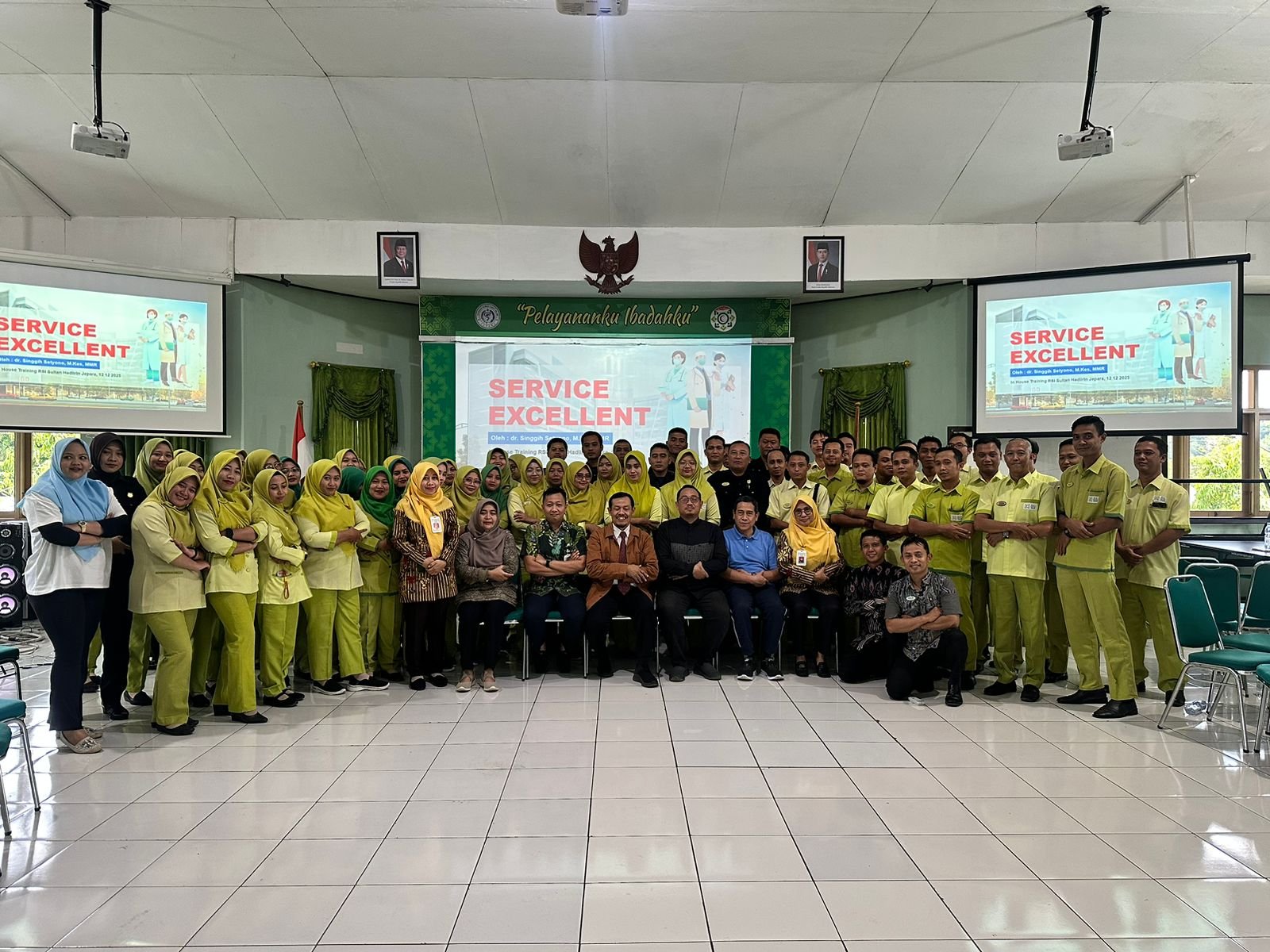 Acara kemudian diakhiri dengan sesi foto bersama dr. Singgih Setyono, M.Kes, MMR, yang menjadi simbol komitmen kolektif seluruh karyawan RSI Sultan Hadlirin Jepara untuk mengaplikasikan ilmu Service Excellent demi mewujudkan pelayanan kesehatan yang prima dan unggul di Jepara.